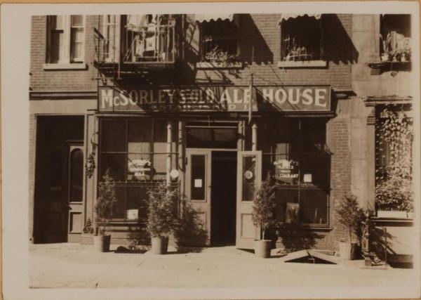 McSorley’s Old Ale House is the oldest “Irish tavern” in New York City, though its claim to have been established in 1854 is questionable. Immigration records show that founding proprietor John McSorley arrived in New York in 1851, but city records indicate that the site on East Seventh Street was vacant through 1858, with a two-story building recorded in 1861 and the present five-story structure in 1865. It is, however, possible that the purported 1854 tavern was an unrecorded building (ad hoc frame house “shanties” were not uncommon at the time).