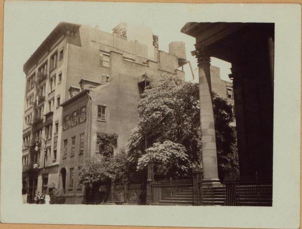 Showing a portion of St. John's Chapel and the church yard. The church and the 3-story house adjoining it have been demolished and its site is now (1937) occupied by station V of the United States Post Office.